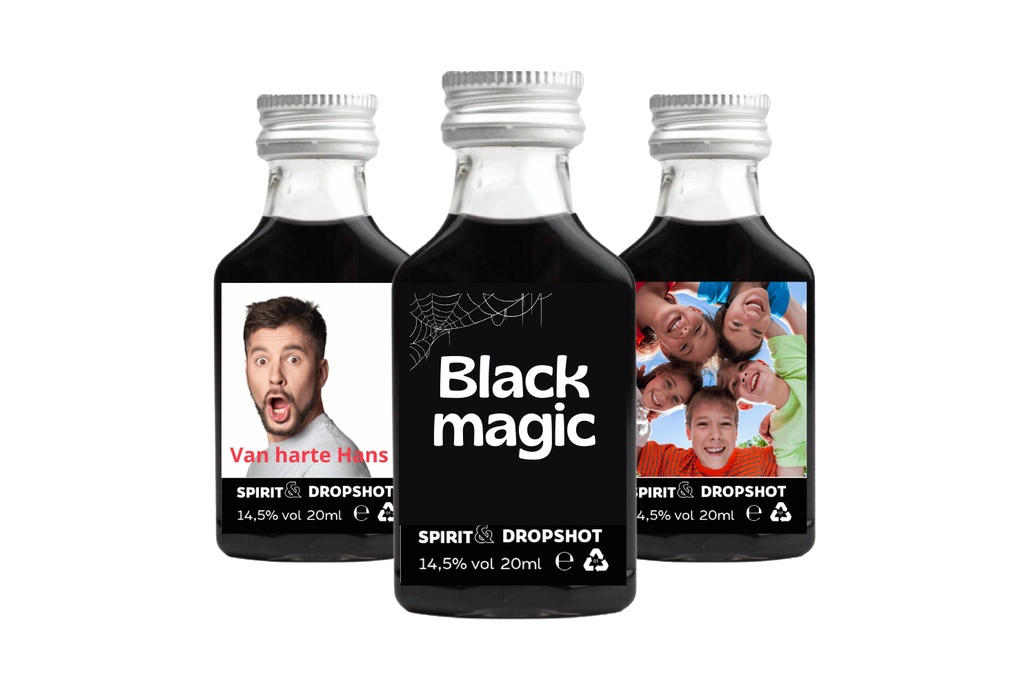 Deze shotjes met drop smaak – gebaseerd op de welbekende Dropshot – zijn typisch Hollands en hebben een alcoholpercentage van 14,5%. Maak je eigen ontwerp voor het etiket, gewoon hier online. Zo creëer je snel een uniek drankje voor verschillende gelegenheden, zoals een sjieke bruiloft, een gruwelijke Halloween of een topavondje met vrienden. Deze zwarte shotjes Drop Shotje zijn altijd een goede keuze.
